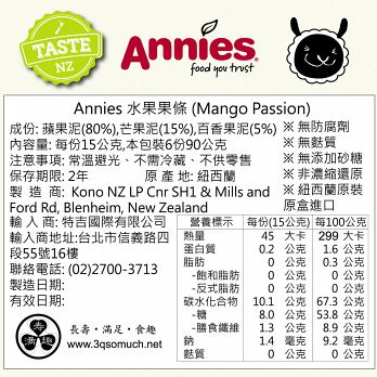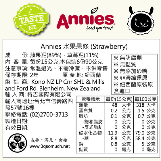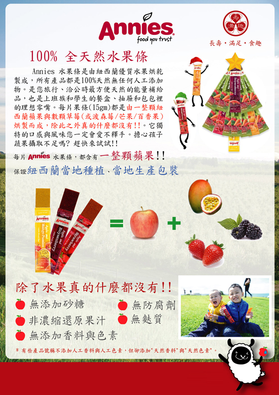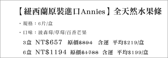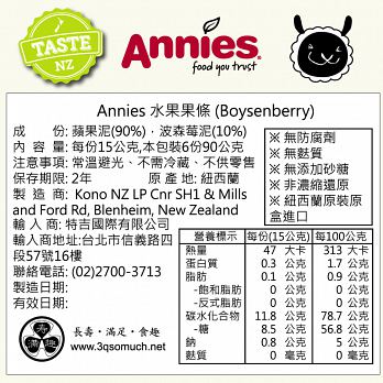 | 紐西蘭原裝進口Annies-全天然水果條-100%全天然水果條,吃進一整顆蘋果與各式水果烘乾製成,獨特口感與風味,解饞又能吃進滿滿營養美味!平均每盒最低只要199元起(含運)即可購得【紐西蘭原裝進口A 售價:199