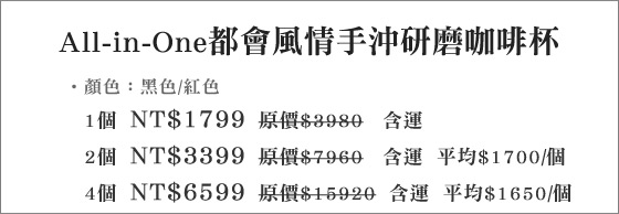 | All-in-One都會風情手沖研磨咖啡杯-只要五分鐘,隨時隨地都能泡出一杯完美的研磨咖啡!304不鏽鋼過濾網,陶瓷研磨刀頭,完整保留咖啡原味平均每個最低只要1650元起(含運)即可購得All-in- 售價:1650