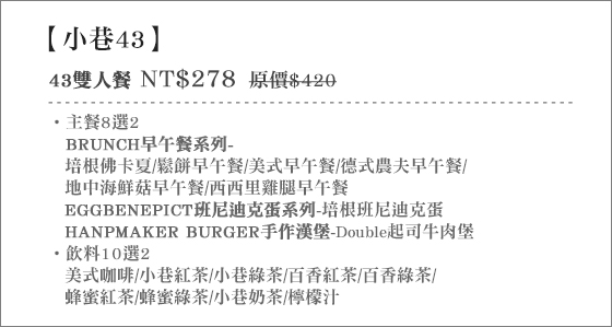 超多的鄉民很都說小巷43-43雙人餐 無敵好的!走過路過,千萬不要錯過!請參閱詳細商品資訊小巷43-43雙人餐還有去各大拍賣網站RUTEN露天、YAHOO拍賣收集商品資料!希望我整理的資料能對我大家JENNYJENNIE有幫助。小巷43-43雙人餐也有些網路上部落客的評價也值得我們參考. |  | 小巷43-43雙人餐-尋找生活中的小確幸,早午餐、手作漢堡等經典美食快來品嚐!溫柔白色鄉村風裝潢,享受輕鬆愉悅時光!只要278元(雙人價)即可享有【小巷43】原價420元43雙人餐:BRUNCH早午餐 售價:278