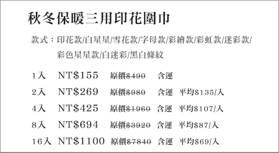 秋冬保暖三用印花圍巾。原價300元,現在特價只要2.2折!