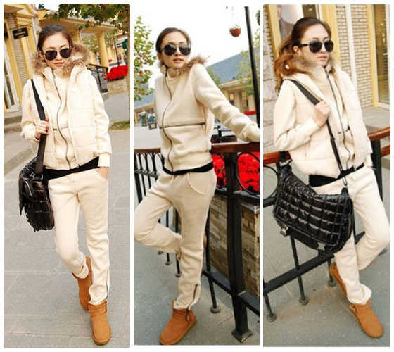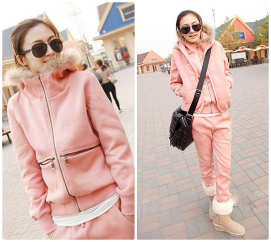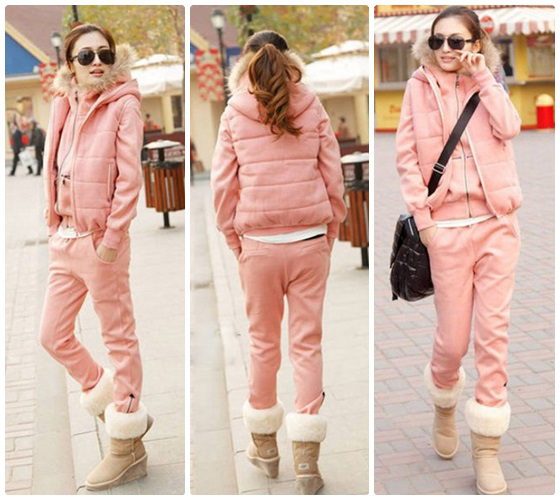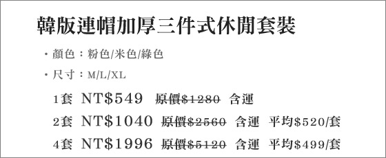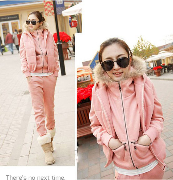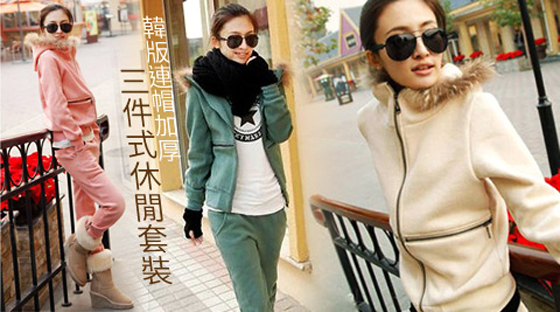 | 韓版連帽加厚三件式休閒套裝-韓妞保暖密技,連帽休閒三件組,粉嫩色系搭配一件外套、長褲與背心,整體完整的時尚感,輕便卻不畏寒平均每套最低只要499元起(含運)即可購得韓版連帽加厚三件式休閒套裝1套/2套 售價:499