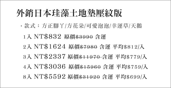 | 外銷日本珪藻土地墊壓紋版-每滴水不漏接,一腳踩過乾淨清爽!外銷日本珪藻土地墊壓紋版,服貼地面不藏汙納垢,取代舊型地墊家庭必備!平均每入最低只要699元起(含運)即可享有外銷日本珪藻土地墊壓紋版1入/2 售價:699