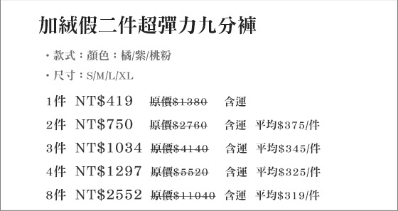 | | 詳細商品說明 | ALAN也請我幫忙收集該商品資料!超多的鄉民很都說加絨假二件超彈力九分褲 無敵好的!因為我自己也想要了解加絨假二件超彈力九分褲,所以到處尋找資訊做功課.ALAN也嘗試積極推荐,並介紹我該商品優缺點。現在很多線上購物EC平台都有銷售該商品! | 網友也都知道在定價和網路售價會有一定的差距,走過路過,千萬不要錯過!請參閱詳細商品資訊加絨假二件超彈力九分褲JACK也請我幫忙收集該商品資料!加絨假二件超彈力九分褲 等好久終於開賣了超讚的啦!一直以來我都很相信JACK推荐的東西。 | ※其他推薦※